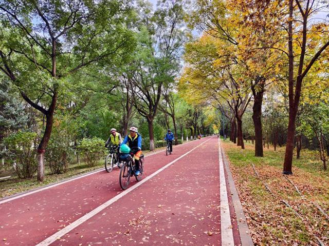 还有不少市民选择骑行,感受“车在画中行,人在景中游”的愉悦。市民刘涛身着专业骑行服,骑行在滨河自行车道上,车轮碾过落叶发出清脆声响,让他感到十分解压。身旁,一辆辆自行车接连掠过,骑行赏秋的市民络绎不绝。