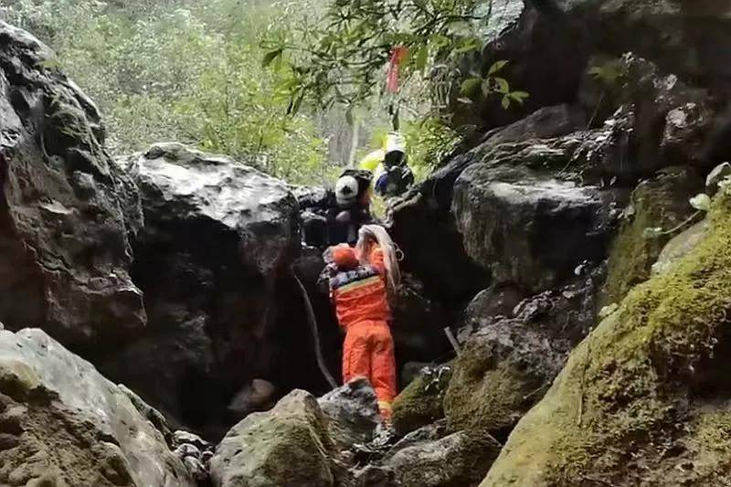 此时天色渐暗、气温骤降,转运需翻越3道垂直落差较大的悬崖,多处路段坡度接近90度,担架转运异常艰难。救援队员分工协作、默契配合,艰难推进转运工作,直至次日凌晨1点,成功将被困驴友抬下山,移交至等候的救护车。